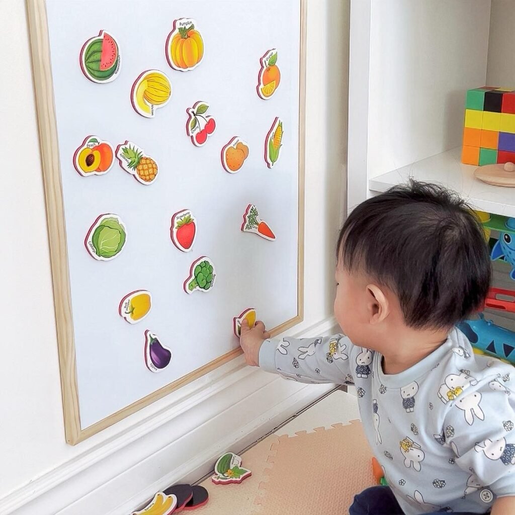 Bé nhà mình rất thích đính những con vậthình trái cây lên bảng, đây trở thành một trong những trò chơi yêu thích mà bé mình gần như chơi mỗi ngày. Mình đã lựa chọn một chiếc bảng nam châm rất nhẹ, có thể treo lên tường hay tháo xuống để bé chơi trên bàn học của bé cũng rất dễ dàng. Để khiến bé chơi được lâu hơn và không bị chán, mình mua thêm một số món đồ nam châm để bé có thể thôi đổi cách thôi khi bé muốn, như khối nam châm, miếng xếp hình nam châm, giúp bé phát triển kỹ năng vận động tinh cũng như phối hợp tay-mắt. Đồng thời, những miễng nam châm có hình ảnh động vật và hoa quả giúp bé học từ vựng bằng nhiều ngôn ngữ khác nhau.