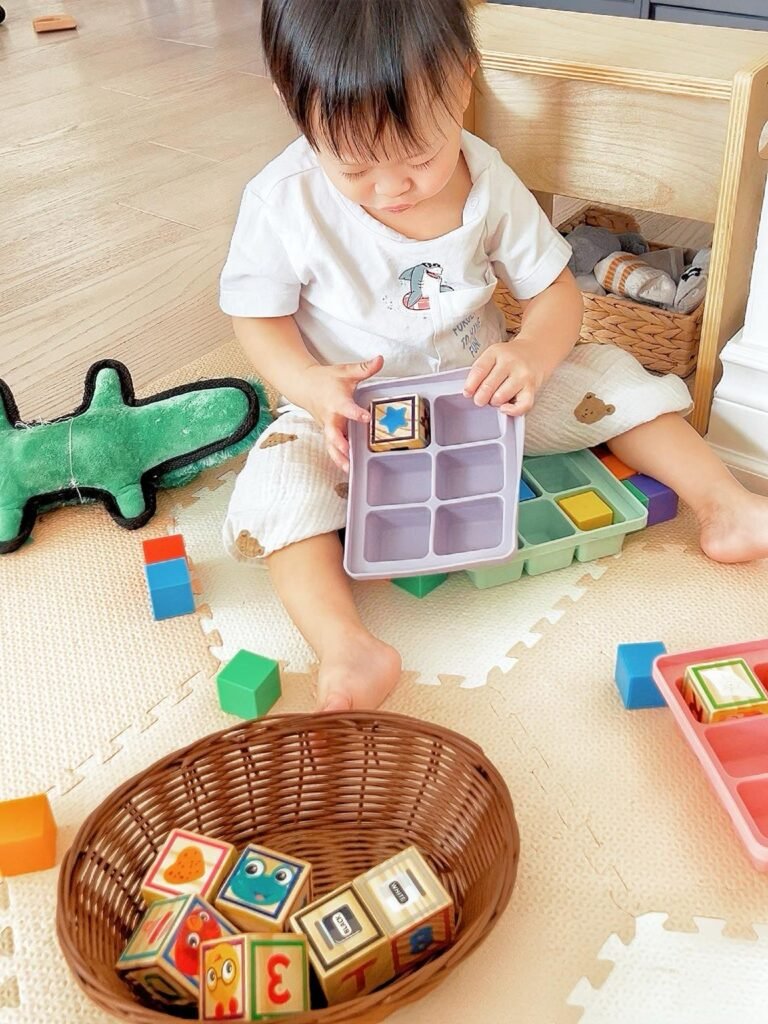 One of the activities my toddler really enjoys is the “Cubes Transfer from Basket to Tray” game. I simply gathered some cubes we already had at home—wooden stacking cubes and magnetic cubes—and placed them in a small basket. Then, I gave him an ice cube tray and encouraged him to pick up each cube and put it into a section of the tray. He loves transferring the cubes one by one and to make it more fun, I sometimes give him different coloured cubes and ask him to match them. It’s such a simple setup, but it keeps him engaged while learning important skills!