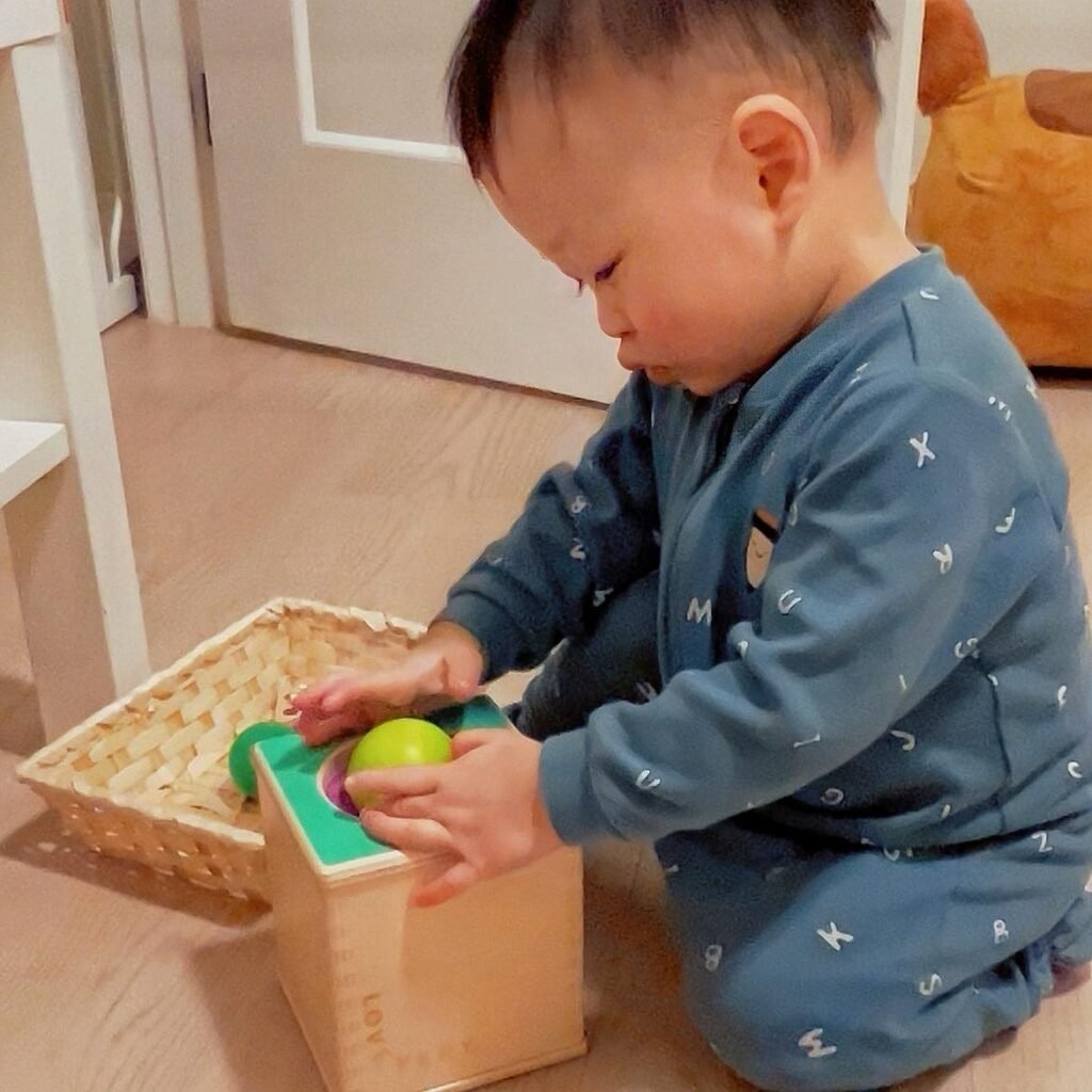 My toddler’s favorite Montessori-inspired activities is the “Balls in a Box” game. I set it up using the Magic Tissue Box in one of Lovevery’s play sets, but you can also use a simple tissue box or an empty milk powder can with a hole cut on top. My child loves picking up small balls and dropping them through the hole, which helps improve hand-eye coordination and fine motor skills. At first, he was just exploring, but over time, I noticed how much his grasping skills and focus improved. To make it more exciting, I introduced balls of different textures and colours, which kept him engaged and curious. It’s such a simple setup, yet it provides endless fun and learning!
